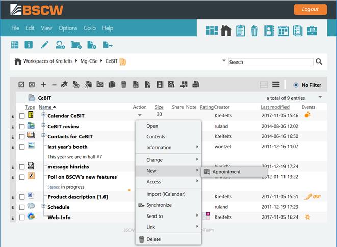 BSCW will not display action menu entries for actions that you may not perform on a specific object. This may be due to the fact that the object type doesn’t allow this action in general or that your role with respect to the object doesn’t let you perform the action. Roles are the basis for access right management in BSCW. You may invite new workspace members assigning roles to them, e.g. ‘teacher’ or ‘student’, if these roles have been defined beforehand. Roles define access profiles and can be attached to any object in BSCW. A set of predefined roles serves as a starting point: Manager, Member, Associate member (cannot invite other members) and Restricted member (read-only access) are default roles – define your own roles at will. Role assignments are inherited via the folder hierarchy and can be modified any time (see 4.2 Access rights and roles).
