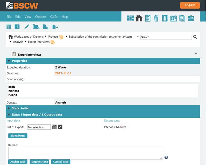 After having defined the project and its phases and after having invited the project team, we can start with creating tasks. As project manager, you start with the phase “Analysis” of our sample project “Substitution of the commission accounting system” and create the first task “Expert interviews and workshops”. This task is to be jointly carried out by two members of the project team. As input data for the task you add the list of the experts to be interviewed and of the prospective participants of the workshops. The result of the task, i.e. its output data, is a document that contains the minutes of all interviews and workshops.
