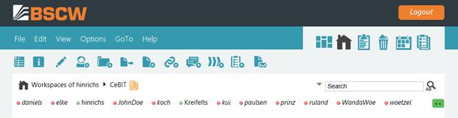 The online status display indicates the “BSCW presence” of members of a shared workspace, i.e. their online status with regard to their activity in BSCW. The online status display is shown below the navigation bar of the shared workspace and is activated with or . In the first case, all members are shown with their online status; in the second case, only those members are shown that have recently been active in BSCW.