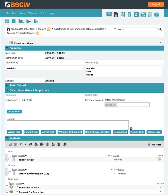 Figure 28 shows the example task after the task has been finished. As contractor, you may at this stage only add further contractors, e.g. early information for later project phases ([Assign task]), forward the task to other contractors, because you go on a holiday ([Forward task]) or [Withdraw task results]. The latter action gives you and the other contractors the opportunity to edit the output data again, in this case the interview minutes, and then finish the task a second time (also see next section).