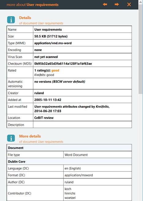 o Document under version control: The info page additionally shows the version history as a table. By clicking the version number, you may download a specific version to your local system.