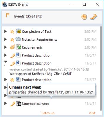 In both the widget lists and the folder hierarchy of the navigator widget, a click on one of the entries shown opens the respective page in a new tab of your Web browser. This page then shows e.g. a BSCW folder, a document or an appointment. With events, a click opens the object concerned. The display of BSCW contents from within a desktop widget requires that you are logged in to your BSCW server with your Web browser.
