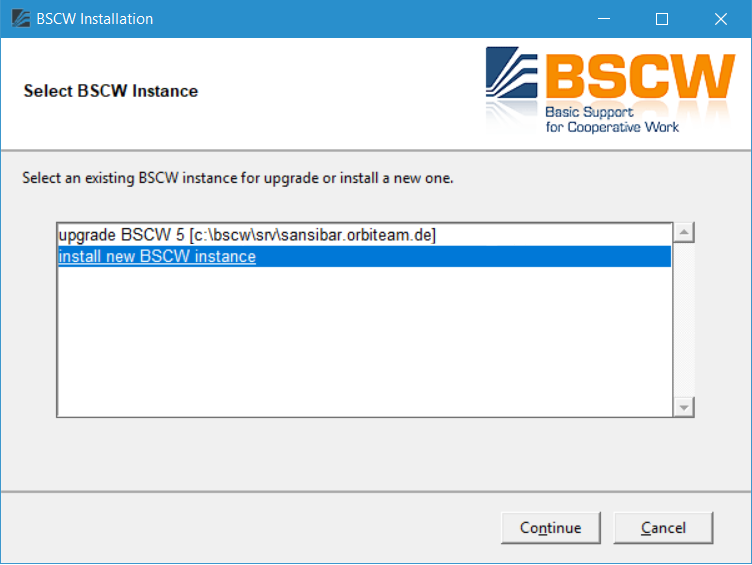 Select “install new BSCW instance” and click . If no BSCW instance runtime is found this step is omitted. Next a console window and a second setup window are opened. To perform an initial instance configuration the following configuration details must be entered: