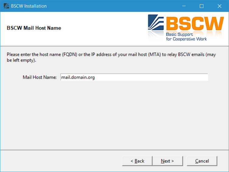 The server root specifies the visible URL for this instance, while the instance name specifies the directory name of the BSCW instance. Next the mail host name is required by BSCW to relay emails. Please enter the (FQDN) or the IP address of your mail host (MTA). While a working MTA is mandatory for BSCW operation, you may leave the server root definition empty for later configuration.