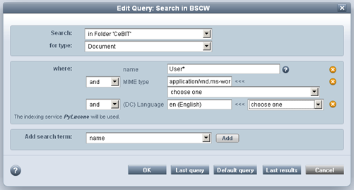 BSCW’s built-in search engine helps you find objects on your BSCW server. You specify your search query in the ‘Edit Query’ form of a BSCW search.