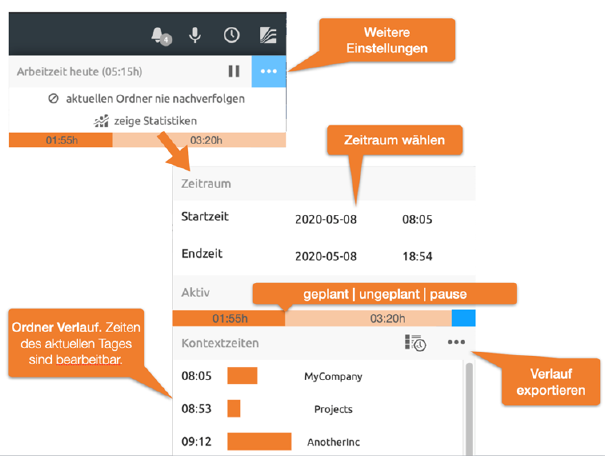 Zeiterfassung Details: Eine detaillierte Auflistung der Arbeitszeiten erreichen Sie über im Verlauf-Menü.