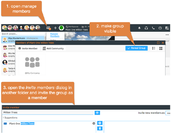 If you organize your workspaces via groups, new users can be invited to the corresponding groups and thus get access to all relevant workspaces without much effort. In addition, the group folders serve as interest-related exchange folders or distribution lists.